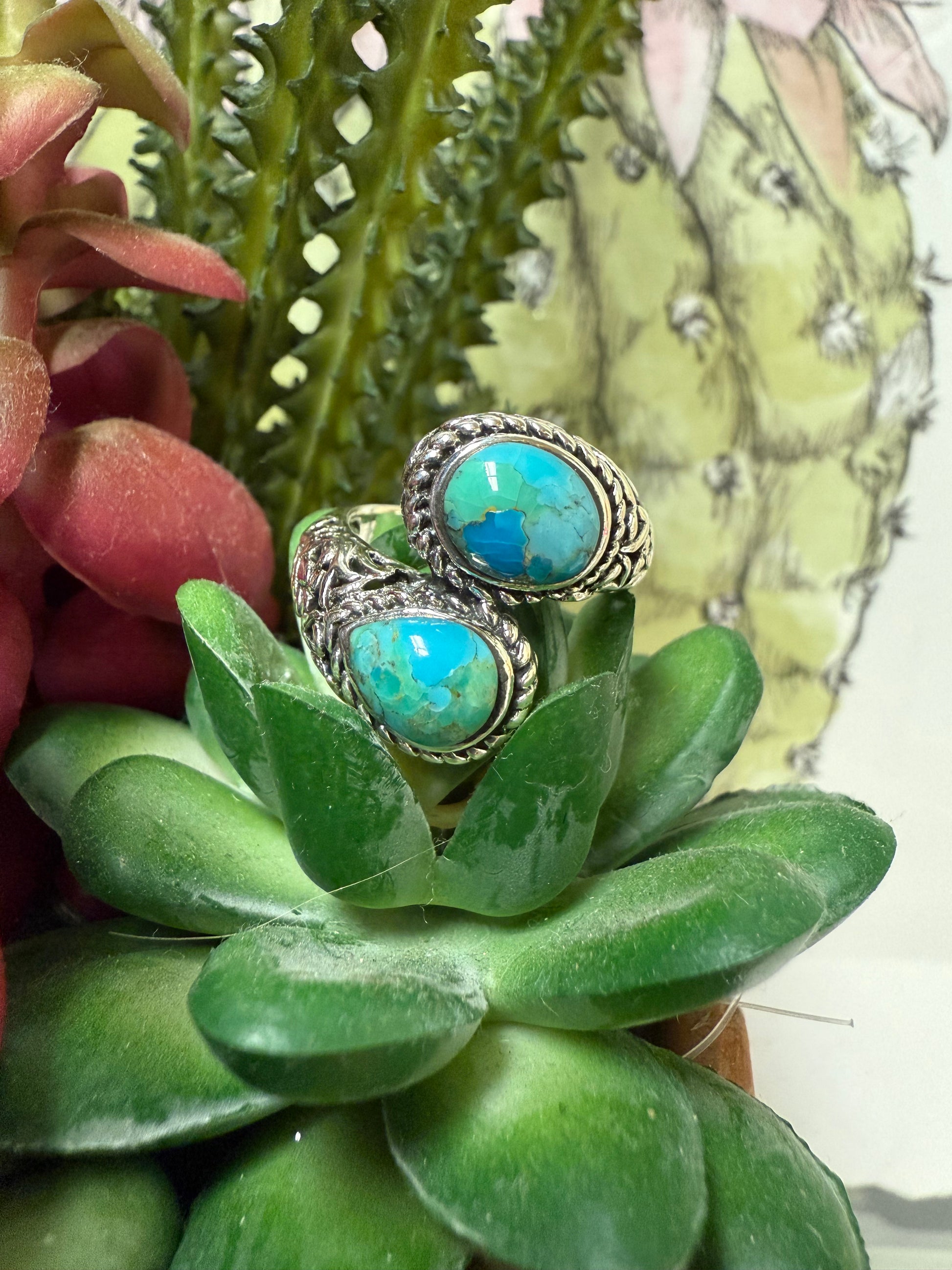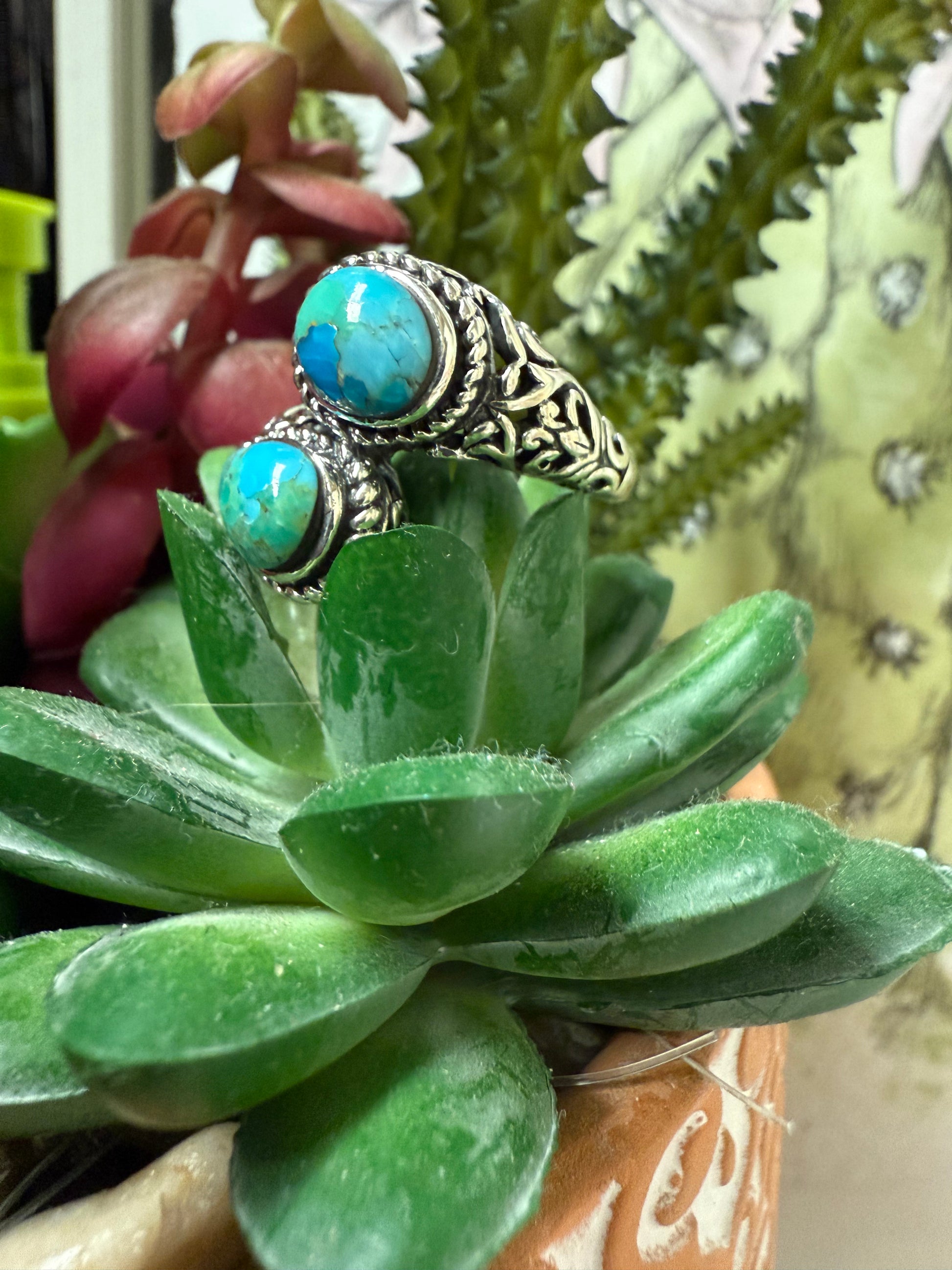 Crafted from sterling silver, this adjustable wrap ring features two exquisite turquoise stones set in delicate filigree detailing. Its timeless boho design offers a sophisticated yet authentic accessory that complements any style. Durable and elegant, this piece is a lasting treasure for those who appreciate genuine craftsmanship and classic beauty.