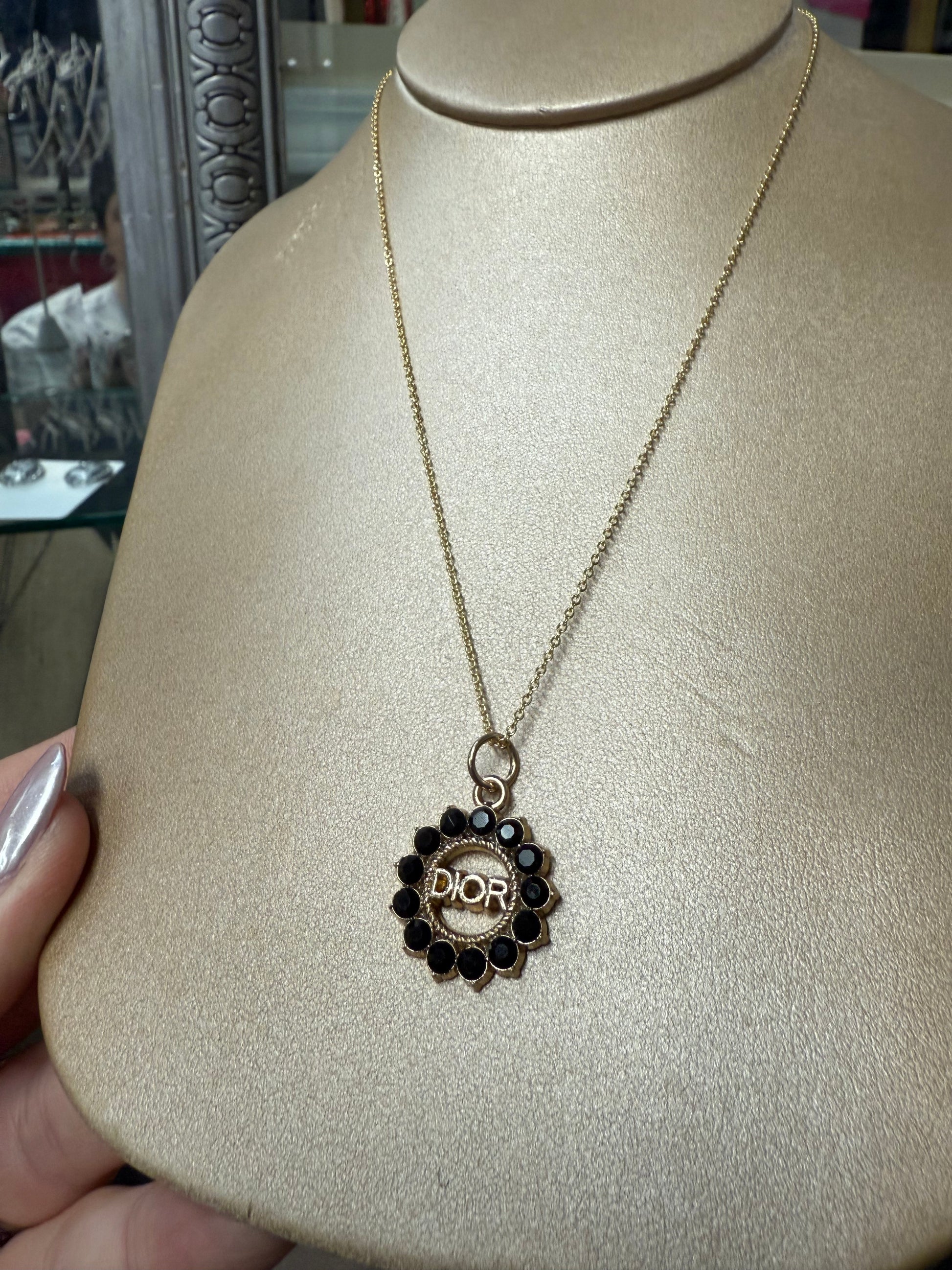 Gold Tone Black Gemstone Circle Pendant Necklace