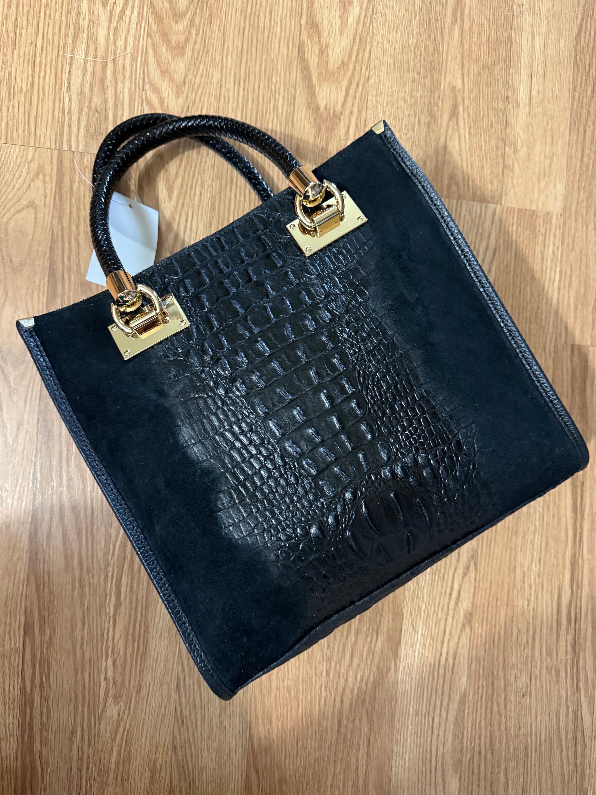 This gorgeous black and gold Hardware bag is bag in Italy. Timeless and perfect for any occasion.