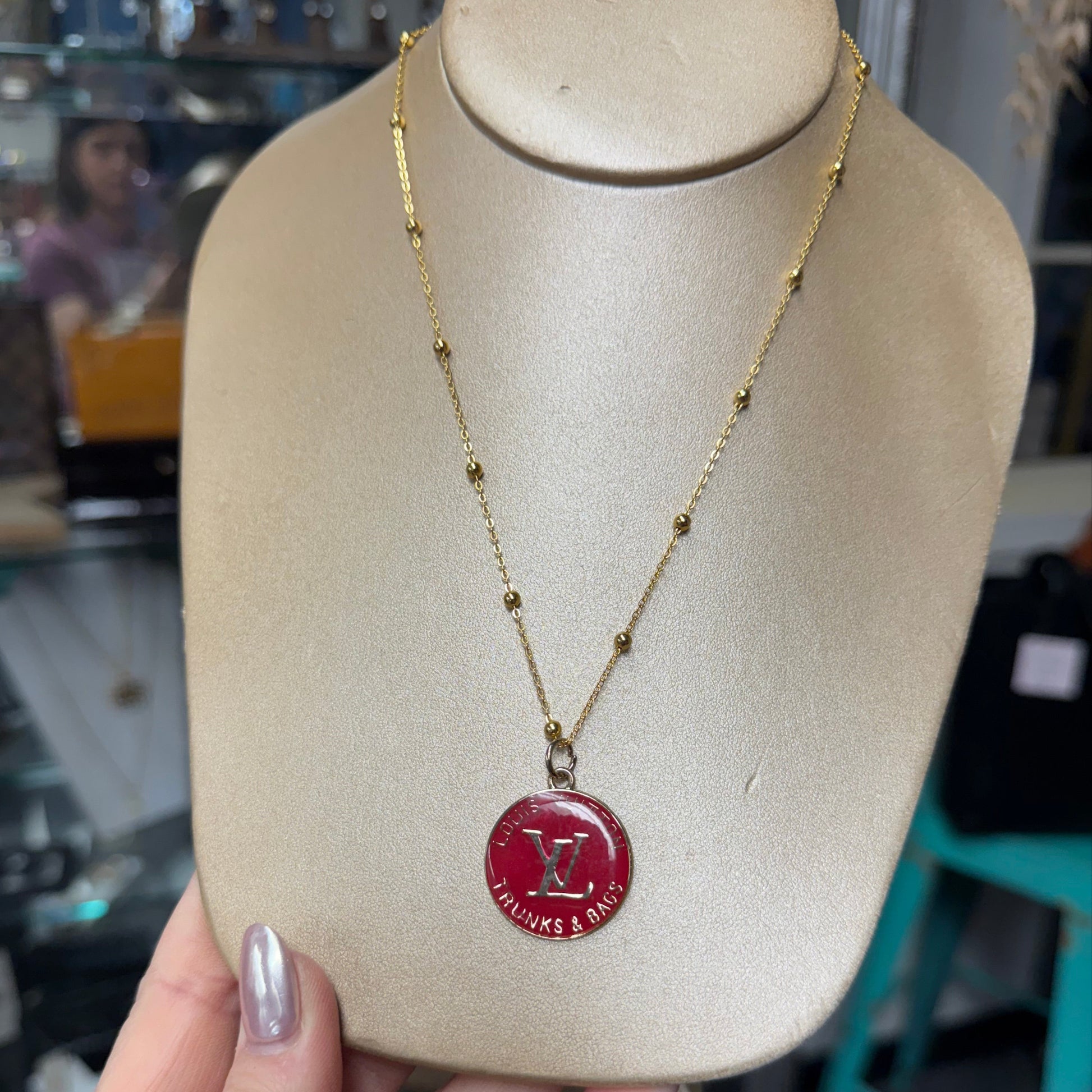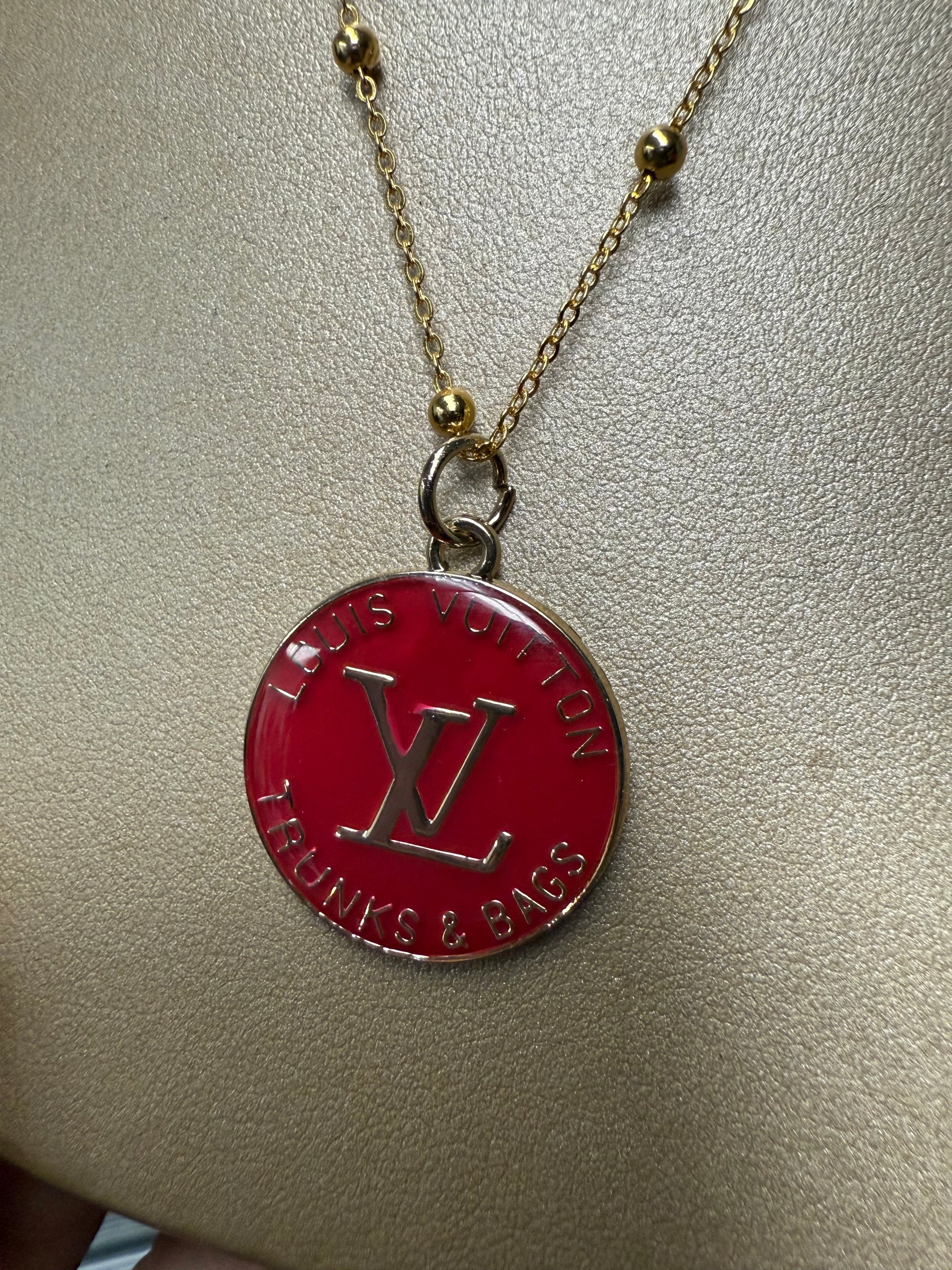 This statement necklace features a striking red enamel medallion pendant on a gold tone chain with delicate bead accents. The bold pop of color adds instant charm and sophistication to any outfit. Perfect for everyday wear, layering with other necklaces, or elevating your evening look.