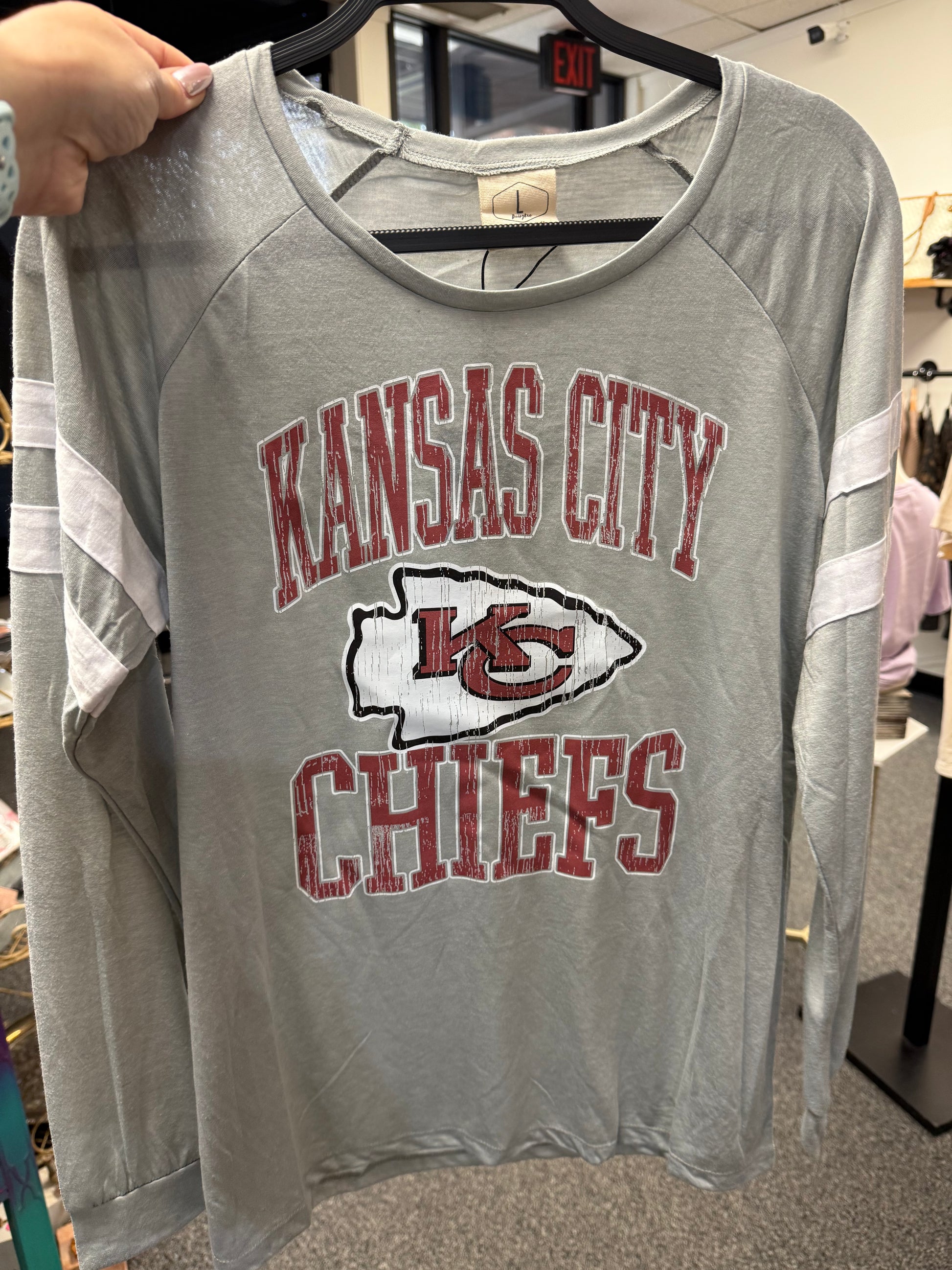 Meet Game Day Striped Sleeve Classic Distressed KC Football from Queen Bee Boutique — designed with boutique quality and everyday style in mind.