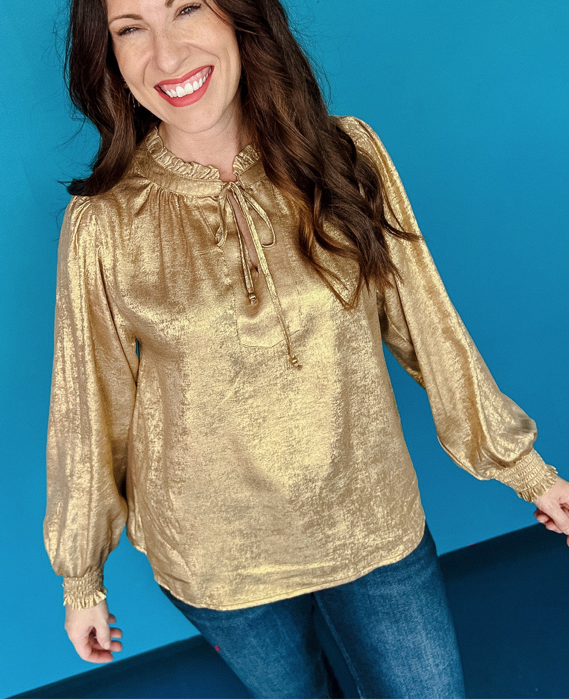 Shimmer and shine in our Golden Hour Shimmer Top. The luxurious metallic fabric adds a touch of glamour, while the balloon sleeves and tie neckline add a playful touch. Stand out from the crowd in this must-have blouse.