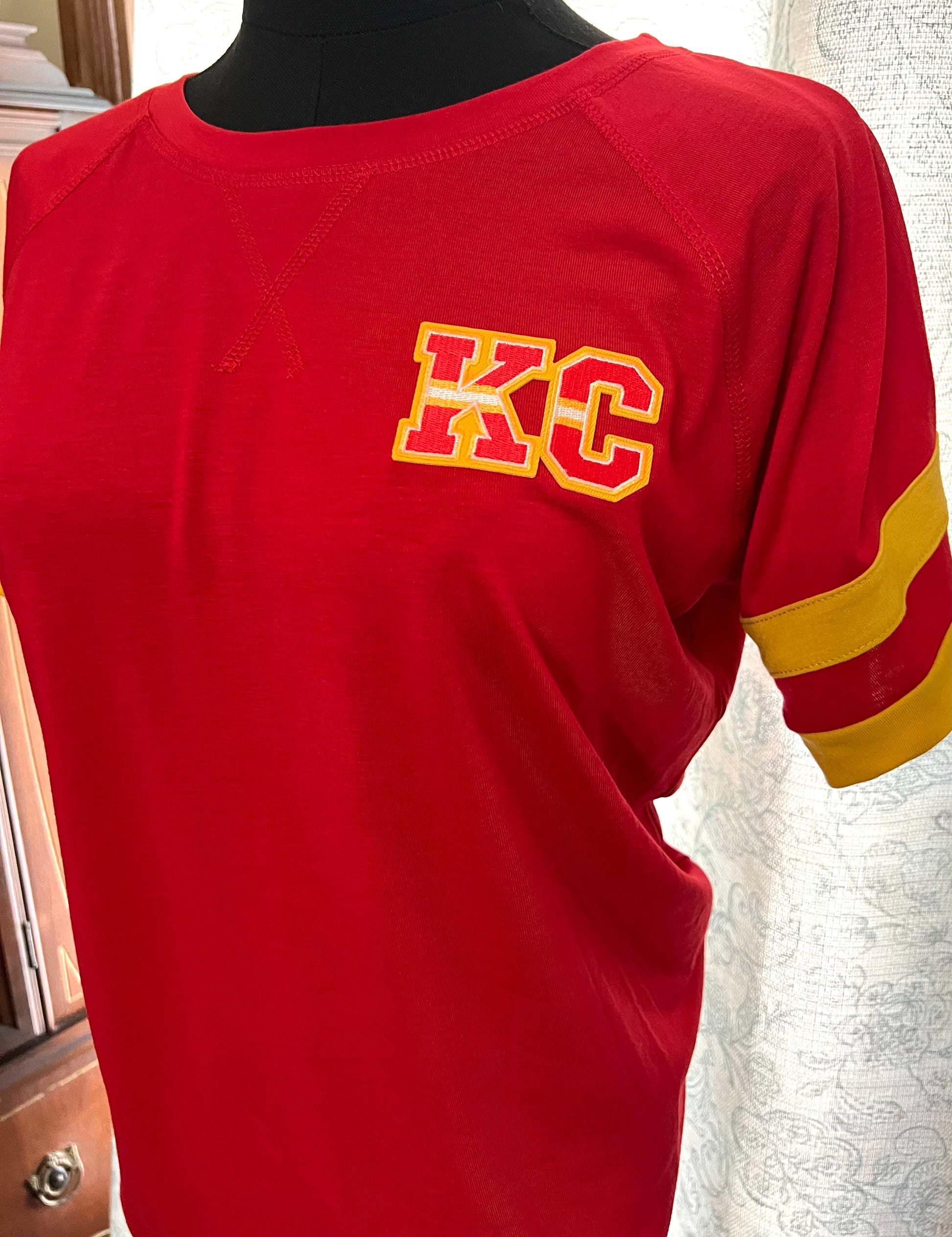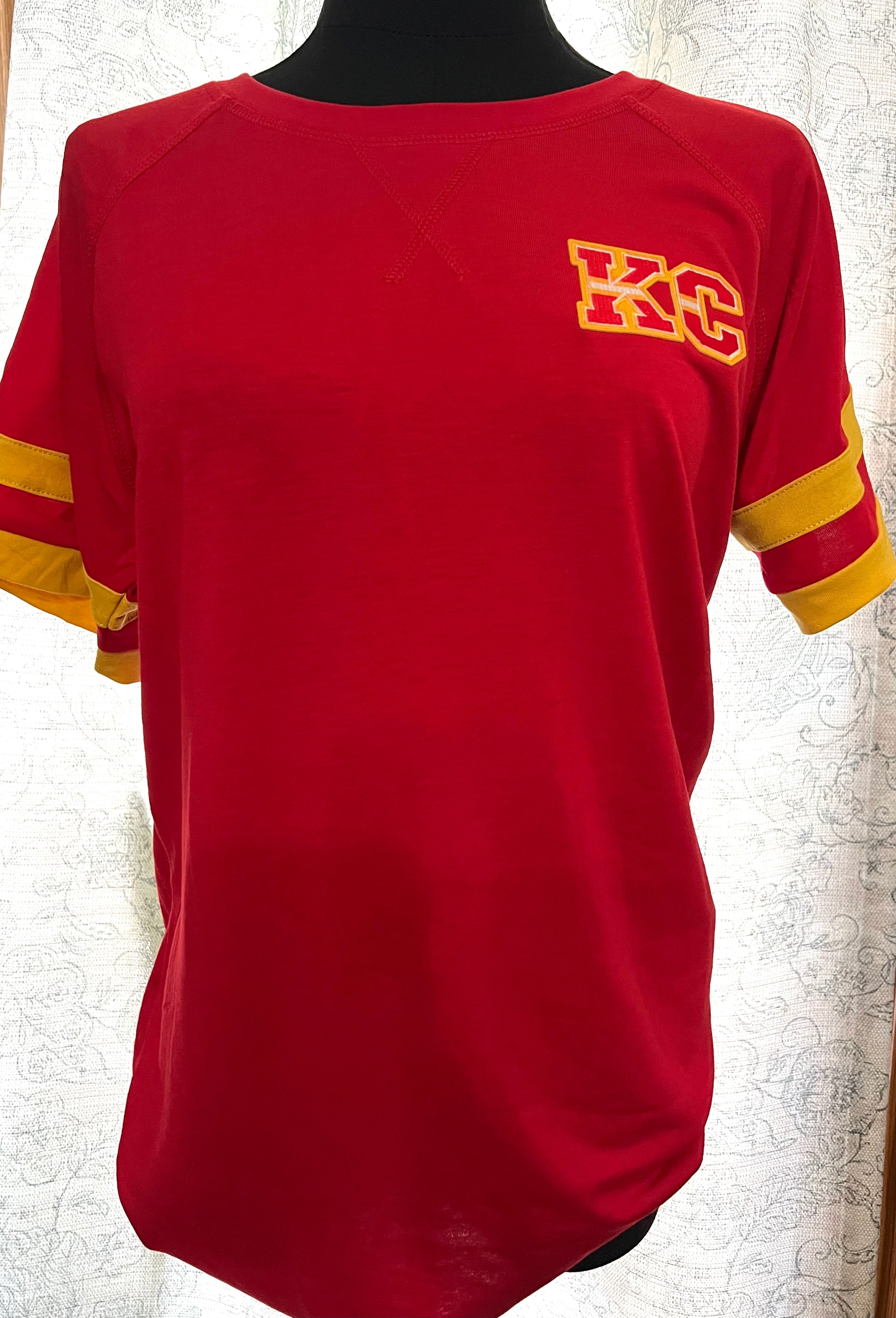 Soft lightweight t shirt material that has a slight v neck an KC patch on left side top corner