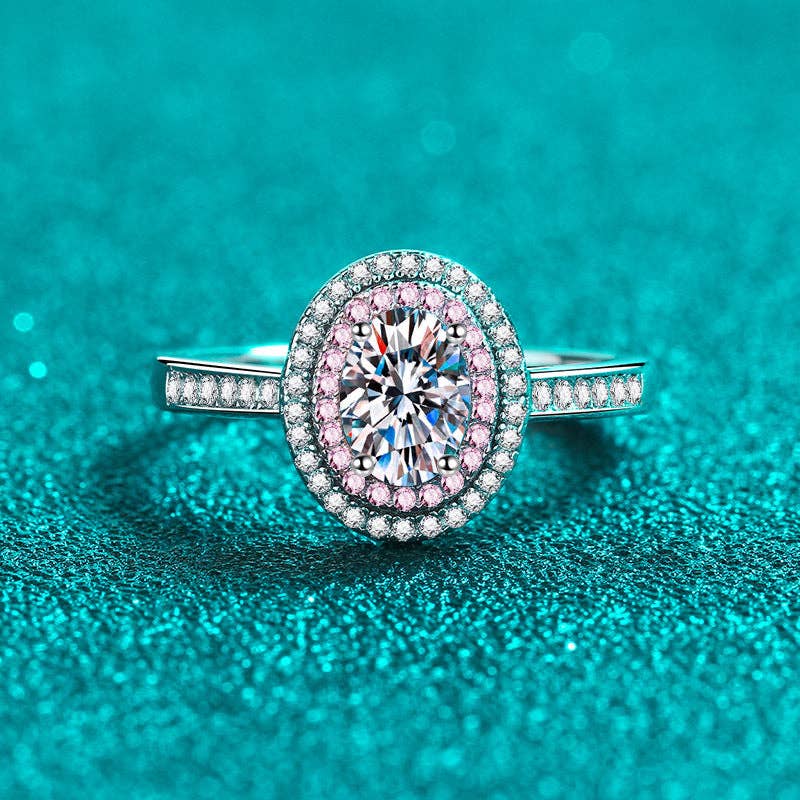 Oval Moissanite & Pink Halo Engagement Ring in 925 Sterling Silver