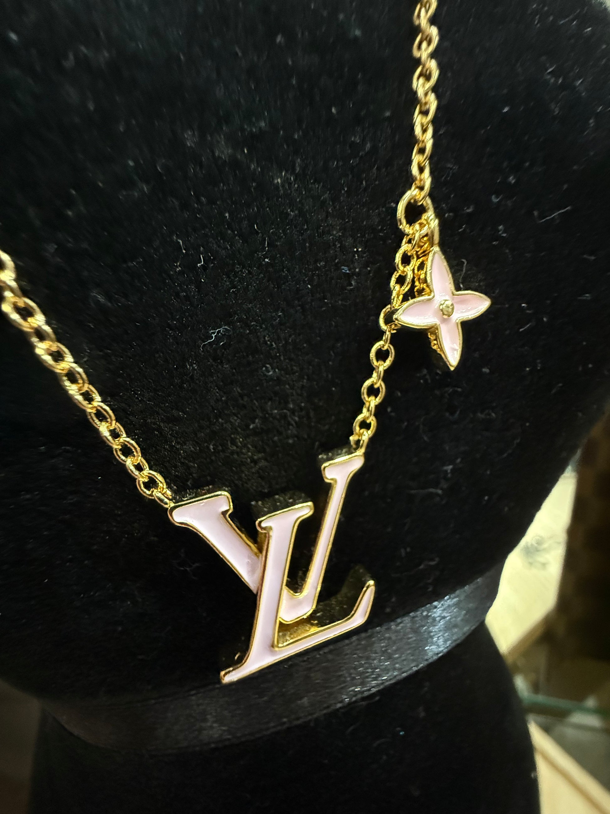 Pink Letter & Flower Charm Necklace β Gold Tone Chain