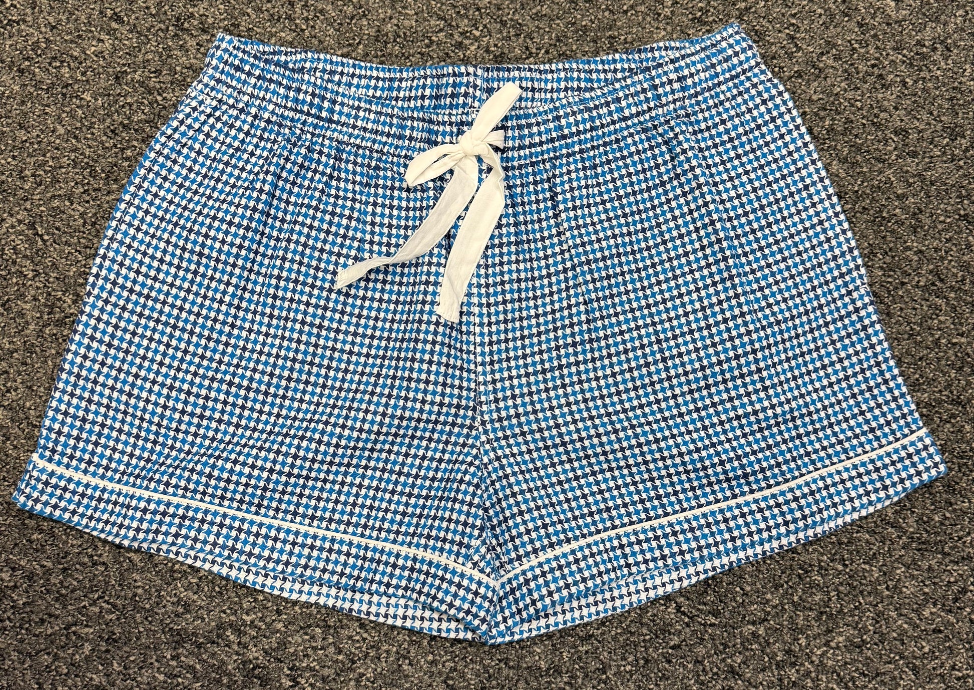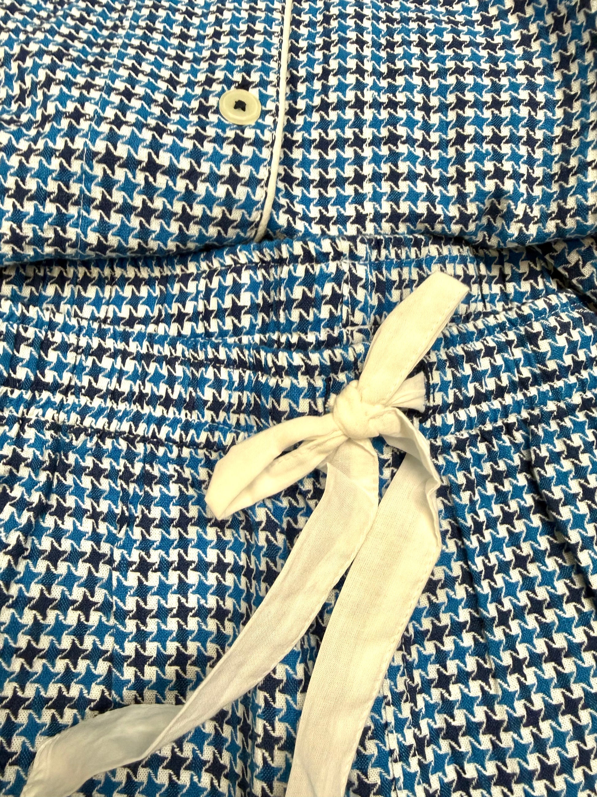 Classic Houndstooth PJ Set – Blue & White Button-Down Top with Tie-Waist Shorts