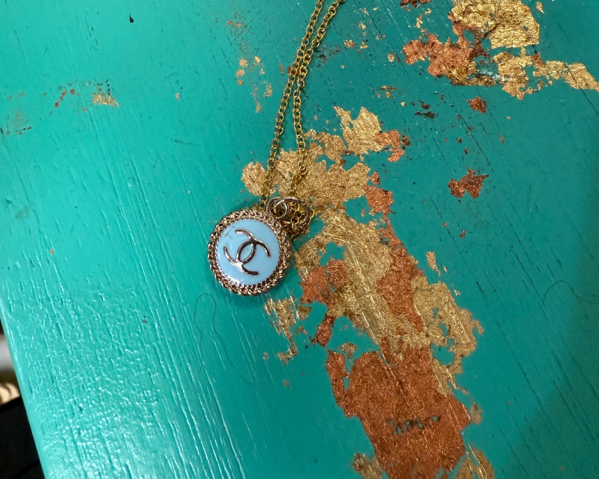 Gold Tone Round Pendant Necklace with Blue Enamel Accent