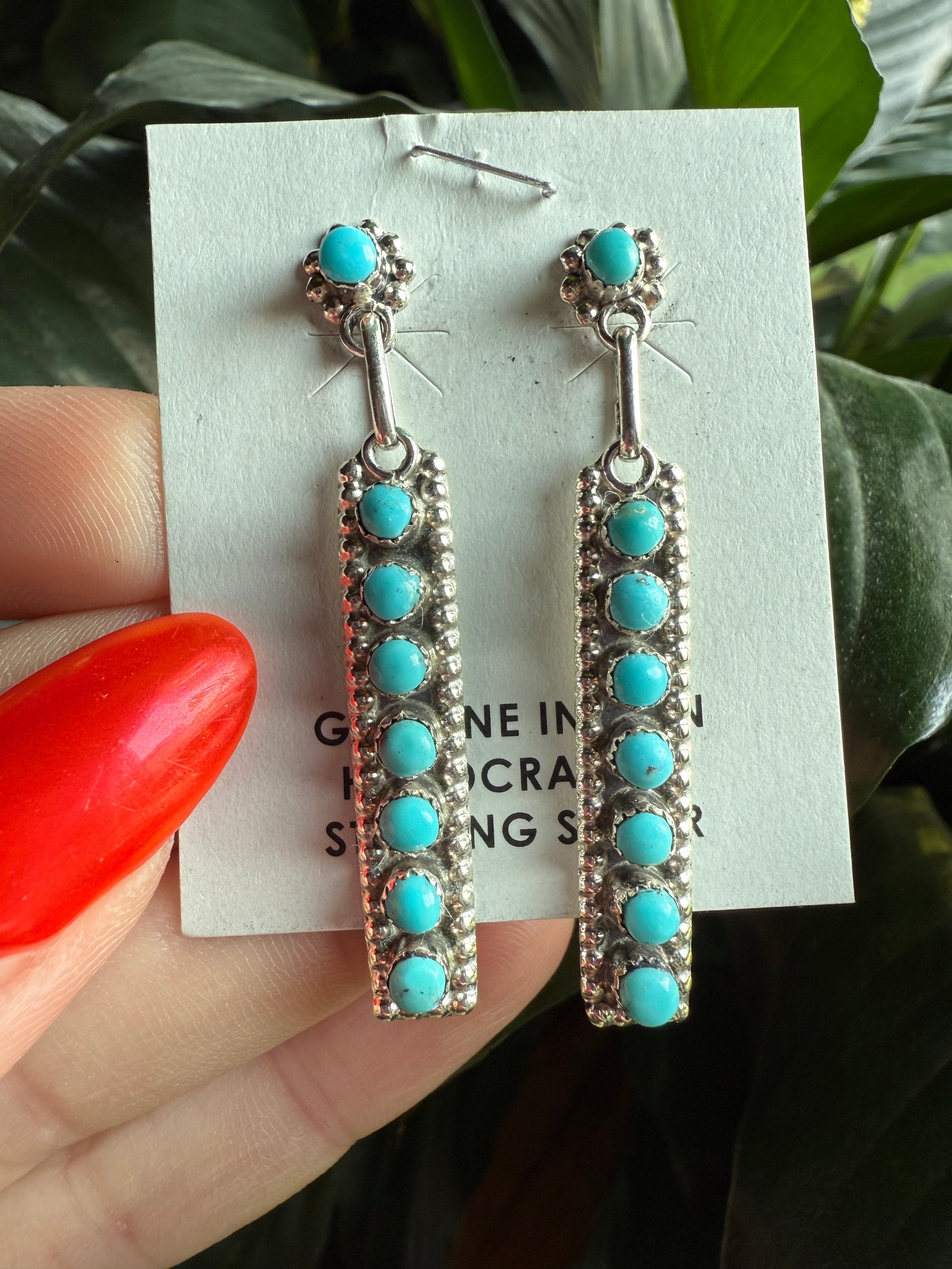 Crafted by skilled Native American artisans in New Mexico, these Sleeping Beauty Bar Sterling Dangles feature authentic sterling silver paired with genuine Sleeping Beauty turquoise stones. The design highlights a distinctive snake eye set, showcasing expert craftsmanship in each post stud earring. Perfect for those who appreciate traditional artistry combined with timeless elegance.