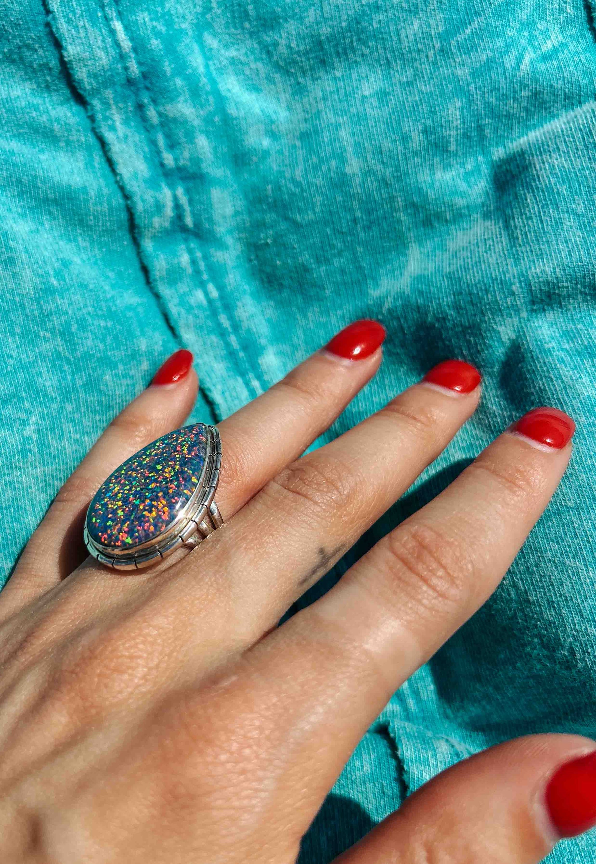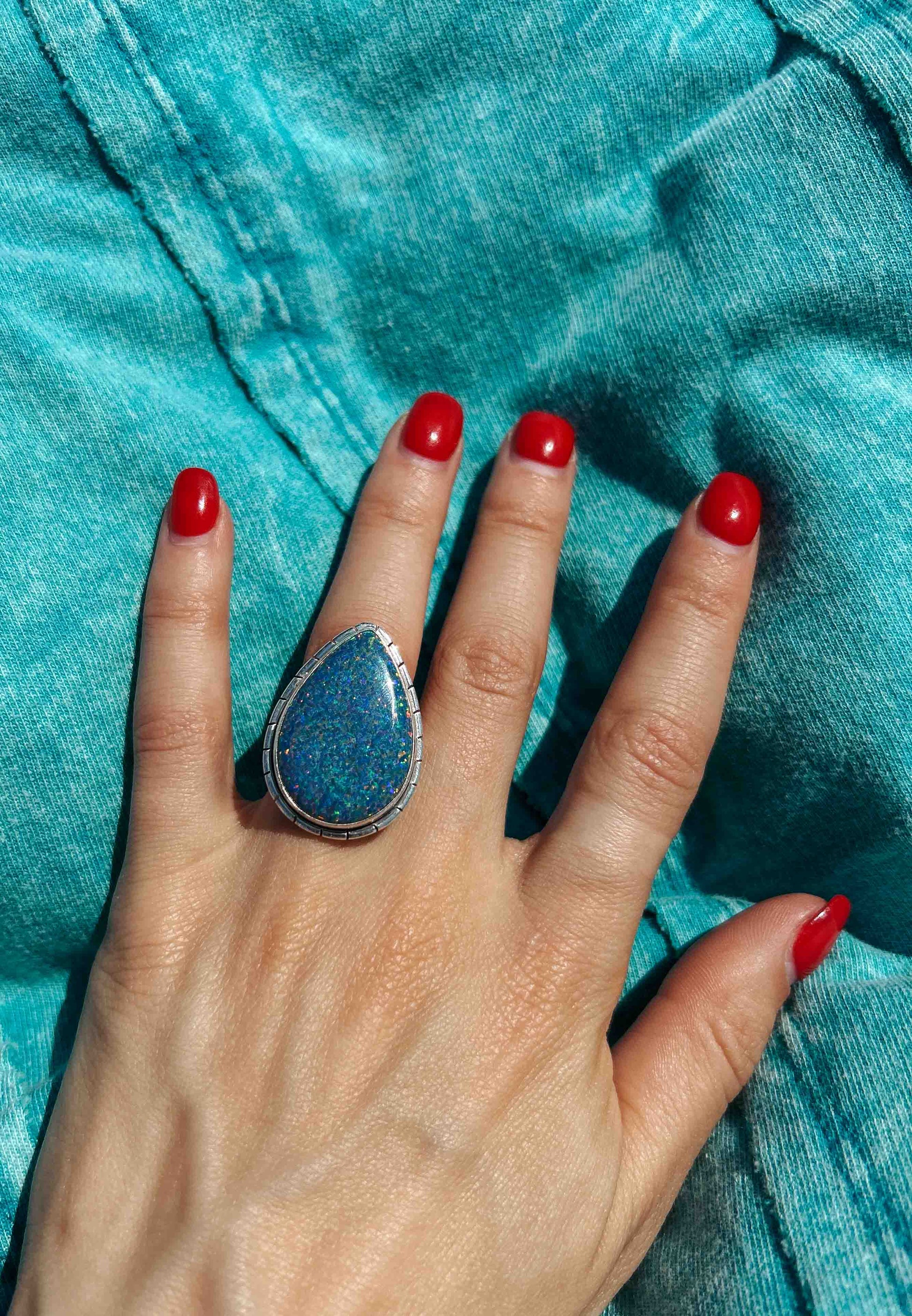 Vibrant Teardrop Design – Show-stopping large teardrop-shaped stone with a dazzling blue opal effect.